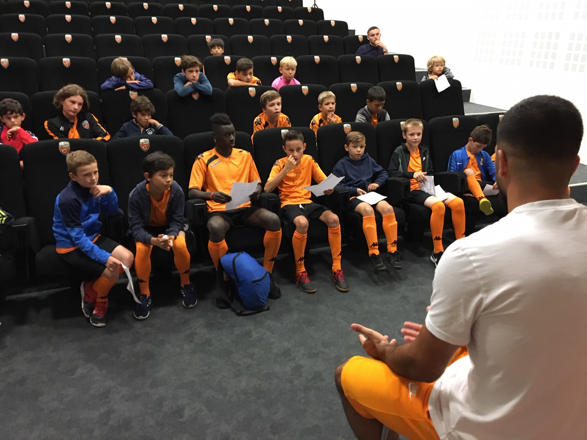A 12h00, nos petites têtes blondes ont eu l’honneur d’échanger pendant plus d’une demi-heure avec Umut Bozok, le nouvel attaquant du FC Lorient. Des questions autour du foot et de ses passions lui ont été posées de manière très conviviale dans l’amphithéâtre de l’Espace FCL. Photos individuelles et de groupe ont été réalisées en fin de rencontre.